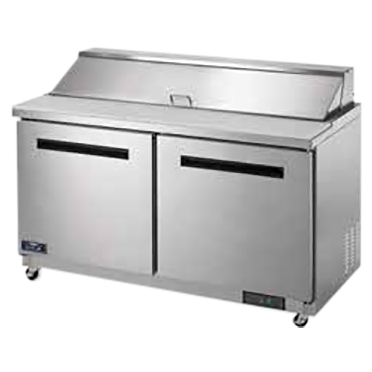 Sip sophistication, redefine freshness with the Arctic Air AST60R Refrigerated Counter, Sandwich / Salad Unit. This two-section prep table is designed to meet the demands of a commercial restaurant setting, ensuring your ingredients stay cool and ready for use. The rear-mounted self-contained refrigeration system, coupled with the electronic thermostat and digital LED temperature display, allows for precise temperature control. The stainless steel top features an 11.5-inch deep cutting board, providing ample space for food preparation. With 16 included 1/6 size pans, you can easily organize and access your ingredients. The two solid hinged self-closing doors and shelves offer convenient storage options. The white ABS interior with a stainless steel floor is easy to clean and maintain. Equipped with four 3-inch casters, including two locking ones, this unit is mobile and can be easily moved around your kitchen. Upgrade your restaurant's efficiency and freshness with the Arctic Air AST60R Refrigerated Counter, Sandwich / Salad Unit.