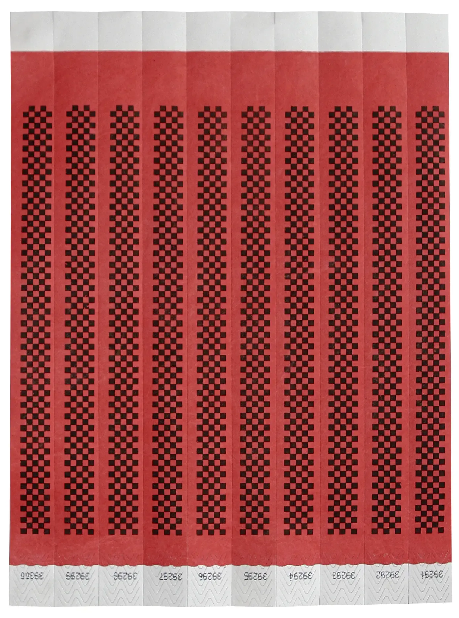 Introducing the Bar Maid/Glass Pro WB-CHECKER, the perfect addition to any commercial restaurant setting. These wristbands are designed with comfort and style in mind. Made with durable Tyvek material, these wristbands are tear-resistant and built to last. Each wristband is sequentially numbered, allowing for easy tracking and organization. The eye-catching checkerboard design in red and black adds a touch of flair to your establishment. Whether you're hosting a special event or simply want to enhance your restaurant's atmosphere, these wristbands are a must-have. Elevate your restaurant experience with these stylish and functional wristbands.