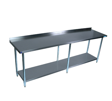 Kitchen innovation at its best, the BK Resources SVTR-1896 Work Table is a must-have for any commercial restaurant. With its 96"W x 18"D stainless steel top, this work table provides ample space for food preparation, making it ideal for busy kitchens. The turndown edges on the front and sides ensure that spills and messes are contained, while the reinforced channels add durability and strength. The 1-1/2" rear riser helps to keep items from falling off the back of the table, while the adjustable stainless steel undershelf provides additional storage space. The 1-5/8" dia. stainless steel legs and stainless steel over plastic adjustable bullet feet ensure stability and easy leveling. NSF certified, this work table meets the highest standards of cleanliness and sanitation. Upgrade your kitchen with the BK Resources SVTR-1896 Work Table and experience the convenience and efficiency it brings to your restaurant operations.