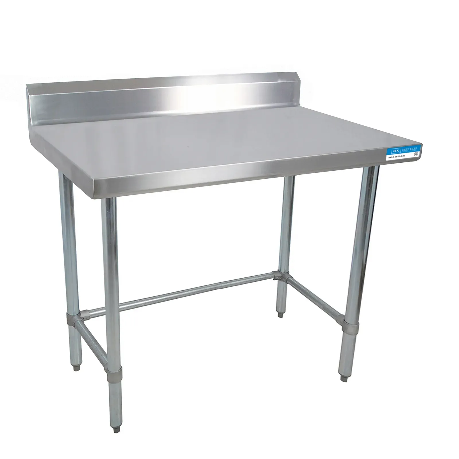 Introducing the BK Resources VTTR5OB-3630 Work Table, the perfect addition to simplify restaurant operations. Crafted by BK Resources, a trusted name in the industry, this work table is designed to enhance efficiency and durability in a commercial restaurant setting. The 36"W x 30"D stainless steel top provides ample space for food preparation, while the turndown edges on the front and sides ensure a secure workspace. Reinforced with channels and featuring a 5" backsplash, this work table is built to withstand the demands of a busy kitchen. The open base with galvanized side and rear bracing adds stability and strength, while the adjustable high impact corrosion-resistant feet allow for easy customization. With 1-5/8" dia. galvanized legs, this work table is built to last. Simplify your restaurant operations with the BK Resources VTTR5OB-3630 Work Table.