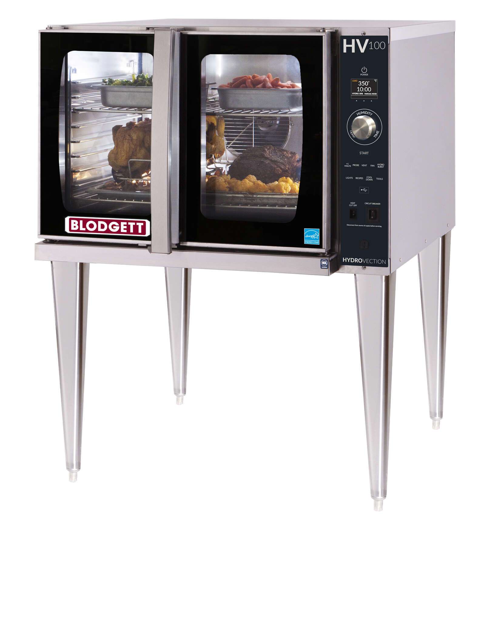 Equip your commercial kitchen with the Blodgett HV-100E SINGLE Hydrovection Oven. This innovative oven is designed to improve product quality and decrease cook times, thanks to its Helix technology that forces air into the oven cavity. The German-engineered D-drive dependent door system creates a 100% sealed environment, eliminating the need for adjustments. The low-E glass doors not only provide a larger viewing area but also remain cool to the touch, resulting in higher cooking efficiencies and reduced surface temperatures. With 15% to 30% faster cooking than a convection oven, this oven will help you serve your customers faster. The SmartTouch2 7" touchscreen allows you to store up to 500 recipes, making it easy to access your favorite dishes. The oven also includes rack timing, multi-shelf recipes, and HACCP storage capability. With its durable angle iron frame and 10-position rack guides, this oven is built to last in a busy commercial kitchen. The Blodgett HV-100E SINGLE Hydrovection Oven is ENERGY STAR qualified, using 80% less water than a full-size combi oven. It also features a self-cleaning spray and rinse system, using non-proprietary chemicals. With a 1-year parts and labor warranty, you can trust in the quality and reliability of this oven. Upgrade your kitchen with the Blodgett HV-100E SINGLE Hydrovection Oven today.