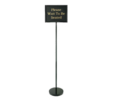 Introducing the Chef Master 90033 Sign, Freestanding, designed to innovate your food service. This freestanding sign is a must-have for any commercial restaurant, offering convenience and versatility. With its aluminum frame, steel pole, and steel base, this sign is built to withstand the demands of a busy restaurant environment. The sign features eight double-sided 11" x 14" P.V.C. signs, each silk screened with gold messages, including 15 pre-printed options and one blank for customization. The signs can be easily stored within the frame, ensuring they are always on hand when needed. The sleek black finish adds a touch of sophistication to any establishment. Whether you want to advertise daily specials, promote upcoming events, or simply welcome guests, the Chef Master 90033 Sign, Freestanding, is the perfect solution. Elevate your restaurant's visibility and attract customers with this high-quality, user-friendly sign.