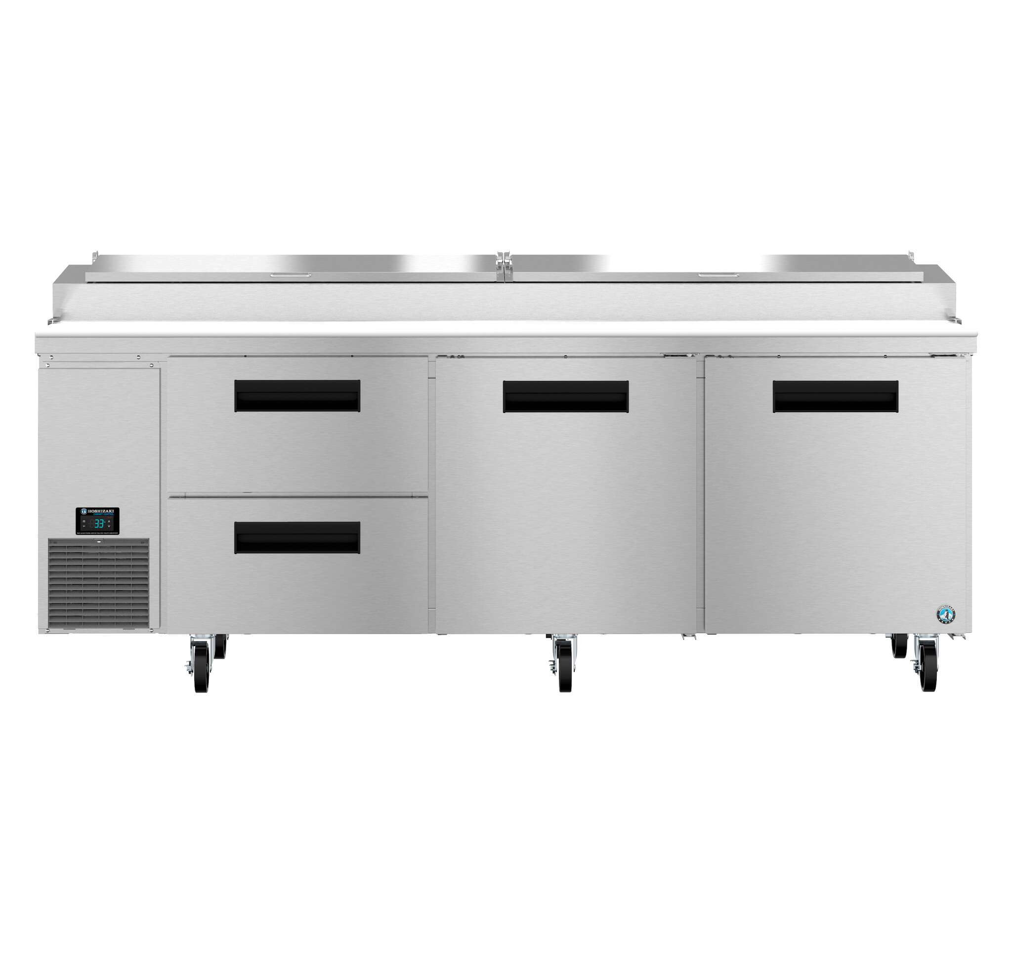 The PR93B-D2 is a Steelheart Series Pizza prep table, three section refrigerator with drawer/door combo. Engineered to maintain food safe temperatures in 100°F ambient conditions and with a net capacity of 29.3 cubic feet, this front breathing prep table refrigerator is the right choice for hot kitchens. It features a dual controller system for ideal temperatures in both the rail and cabinet.