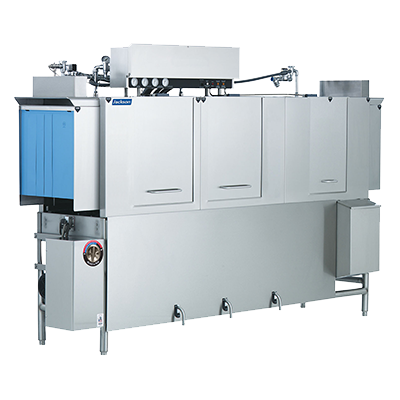 Boost productivity with innovative strategies using the Jackson WWS, AJ-100CS Dishwasher, Conveyor Type. This high-performance dishwasher is designed to meet the demands of a busy commercial restaurant. With adjustable conveyor speed and a high temperature sanitizing rinse, it can handle approximately 287 racks per hour, ensuring efficient and thorough cleaning. The two-tank design, with a wash and power rinse cycle, along with a 36" recirculating prewash, guarantees sparkling clean dishes every time. The stainless steel construction and steam coil tank heat ensure durability and reliability, even in the toughest kitchen environments. With a 25" clearance and 8" vent cowls/splash shield, this dishwasher accommodates large and tall items with ease. The vent fan control helps maintain a comfortable working environment. Trust the Jackson WWS, AJ-100CS Dishwasher, Conveyor Type to streamline your dishwashing process and keep your restaurant running smoothly.