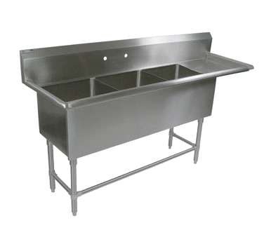 Modernize operations with smart choices using the John Boos 43PB184-1D24R Sink. This three-compartment sink is designed to streamline your restaurant's dishwashing process, ensuring efficiency and cleanliness. With its 14300 stainless steel construction, this sink is built to withstand the demands of a busy commercial kitchen. The three 18" x 18" x 14" deep compartments provide ample space for washing, rinsing, and sanitizing dishes, while the 24" right drainboard offers convenient drying and storage. The 10" high boxed backsplash with a 45° top and 2" return helps prevent water splashes and spills, keeping your kitchen area clean and safe. The sink also features a set of splash mount faucet holes with 8" centers, allowing for easy installation of faucets. With adjustable legs, front and side bracing, and bullet feet, this sink can be customized to fit your restaurant's specific needs. NSF and CSA-Sanitation certified, this John Boos sink is a reliable and durable choice for any commercial restaurant.