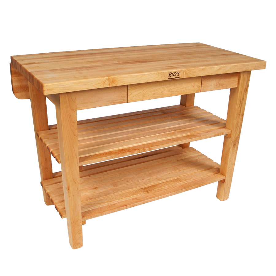 Upgrade workflow with adaptable resources through the John Boos KIB6038150 Table, Utility. This versatile island bar is designed to enhance efficiency in commercial restaurant settings. With its generous 60W x 38D x 35H overall size, it provides ample space for food preparation, plating, and serving. The 1-1/2" thick edge grain top, made of antimicrobial Northern Hard Rock Maple, ensures a hygienic surface for food handling. The top is finished with Antimicrobial Boos Block Cream and Beeswax, further enhancing its durability and resistance to stains and odors. The island bar features an 8 drop leaf, allowing for additional workspace when needed. The 15 utensil drawer provides convenient storage for kitchen tools, while the 2 slatted undershelves offer space for storing ingredients or equipment. With its wooden legs and easy assembly (KD), this table is a reliable and practical addition to any commercial kitchen. Upgrade your restaurant's workflow with the John Boos KIB6038150 Table, Utility.
