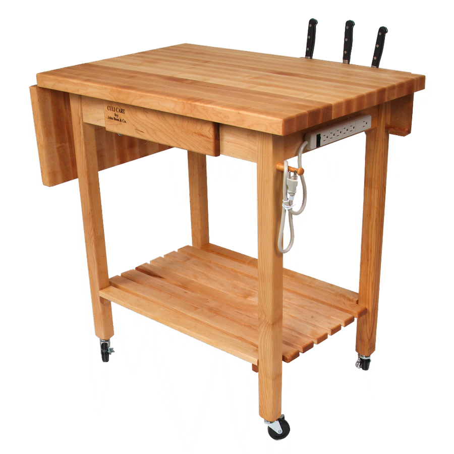 Streamline workflow with innovative resources using the John Boos QCL Table. This versatile utility table is designed to enhance efficiency in commercial restaurant settings. With its deluxe culi cart design, it offers a spacious 48W x 24D x 36H overall size, providing ample workspace for food preparation and service. The 1-1/2 inch thick edge grain top, made from antimicrobial Northern Hard Rock Maple, ensures durability and cleanliness. The table features an antimicrobial Boos Block Cream Finish with Beeswax, further enhancing its hygiene properties. The 12-inch drop leaf provides additional workspace when needed, while the 15 utensil drawer and knife holder with blade shield keep essential tools within reach. The table also includes a convenient electric outlet strip for powering kitchen appliances. With wood legs, a slatted undershelf, and 2-1/2 inch locking casters, this table offers both stability and mobility. Upgrade your restaurant's efficiency with the John Boos QCL Table.