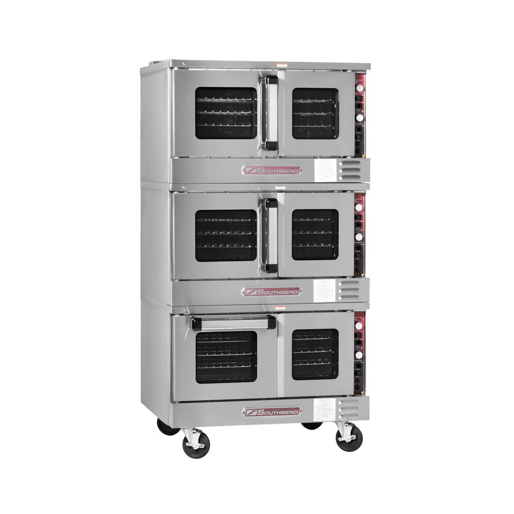 Deliver food perfection with the Southbend TVGS/32SC Gas Convection Oven. This low-profile, triple-deck oven is designed to meet the demands of a busy commercial restaurant kitchen. With its electronic ignition and solid state thermostatic controls, you can easily achieve the perfect cooking temperature ranging from 150 to 550 degrees Fahrenheit. The 60-minute mechanical cook timer ensures precise cooking times, while the oven interior light allows you to monitor your dishes without opening the door and losing heat. The cool-down fan helps to quickly cool the oven after use, allowing for efficient turnaround times. Each oven comes with three racks, providing ample space for multiple dishes. The porcelain oven interior and stainless steel construction make cleaning a breeze. With a powerful 156,000 BTU output and CSA and NSF certifications, this Southbend convection oven is a reliable and high-performing addition to any commercial kitchen.