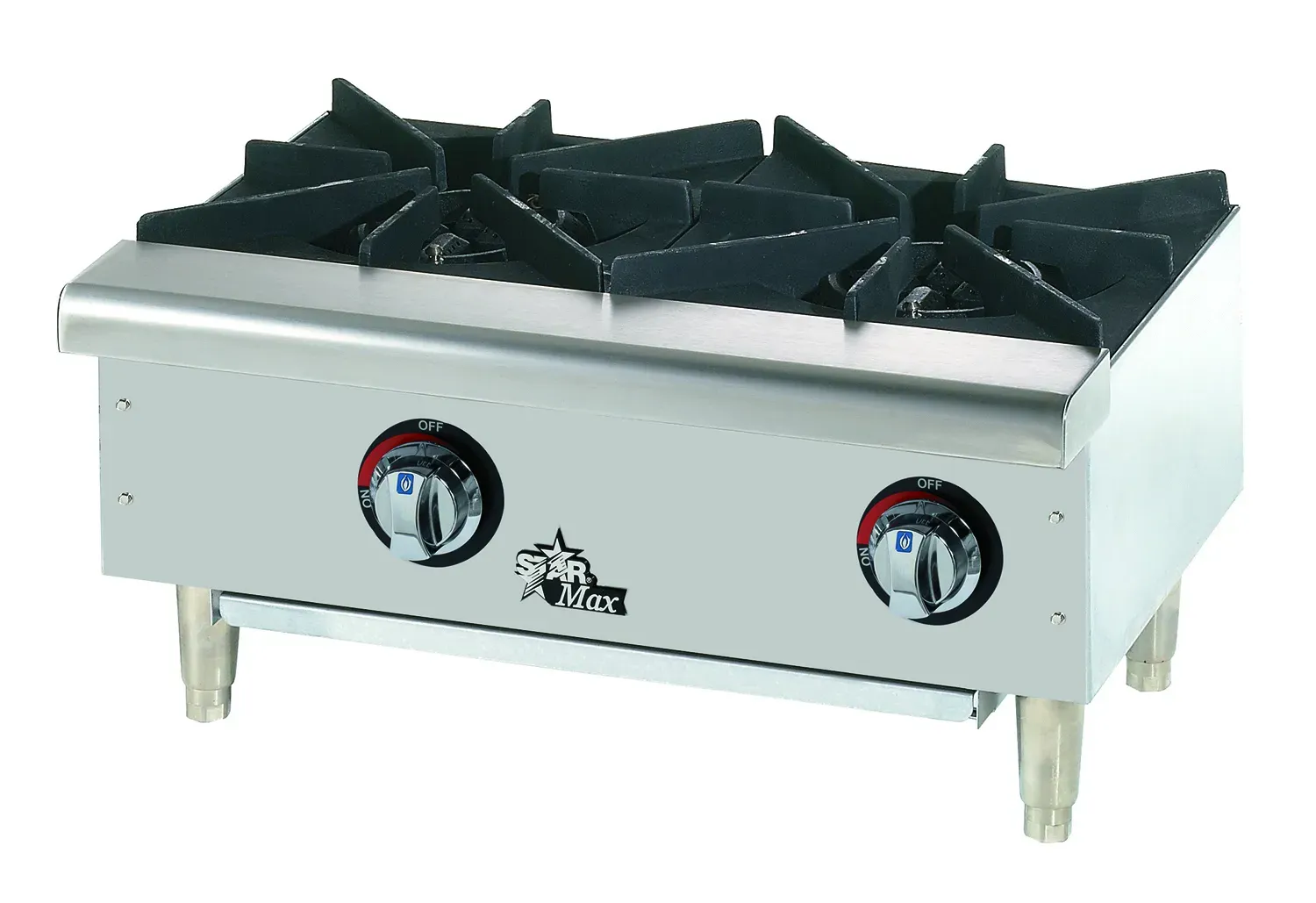 Star-Max® natural gas hot plates are designed for years of maintenance free operation and reliable cooking performance. Whatever the menu item, Star-Max hot plates will out perform the competition. The 602HWF natural gas hotplate features two Front-to-back burners with 25,000 BTUs per burner, and an on-off manual control valve and a standing pilot for each burner.