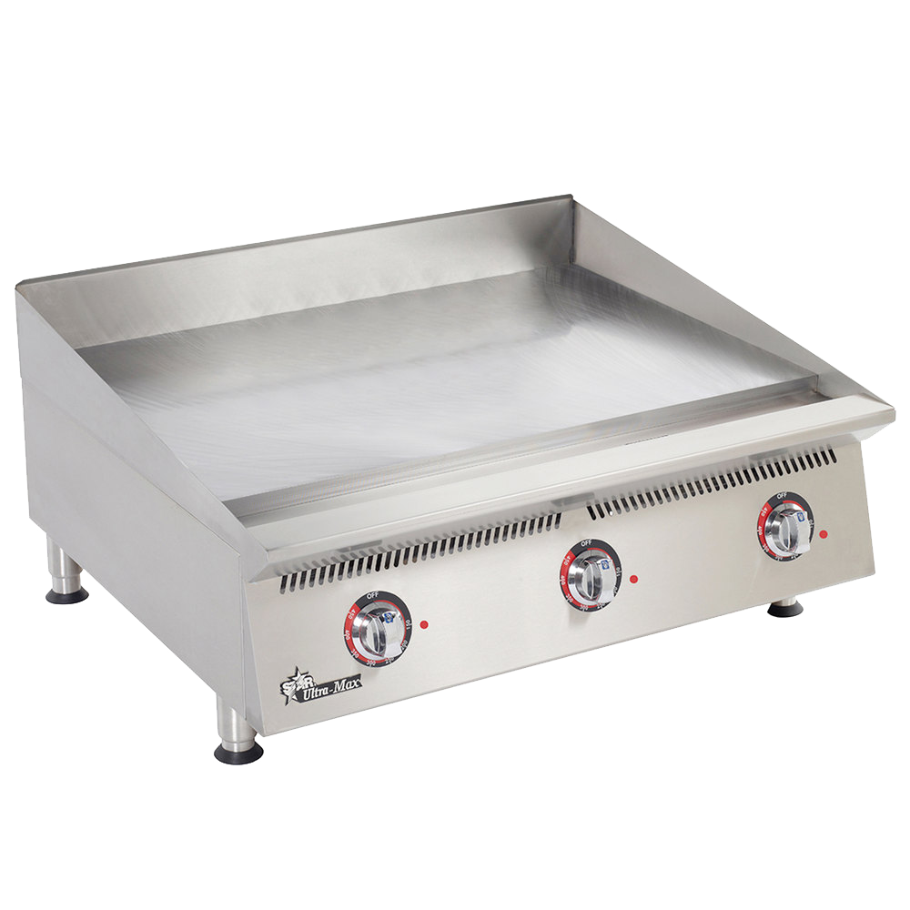 Achieve culinary excellence with the Star, 836TCHSA, Gas Countertop Griddle. This high-quality griddle is designed to meet the demands of a commercial restaurant kitchen. With a 36" wide by 24" deep cooking surface, it provides ample space to cook a variety of dishes simultaneously. The 1" thick T1 steel hexavalent chrome griddle plate ensures even heat distribution and excellent heat retention, allowing for consistent cooking results. The embedded mechanical snap-action thermostat, located every 12", allows for precise temperature control ranging from 150 to 550 degrees Fahrenheit. The griddle also features a 4-3/8" tapered wrap-around splash guard and a 3-1/2" front grease trough for easy cleaning and maintenance. The heavy-duty metal knobs and welded steel frame with a stainless steel exterior ensure durability and longevity. With 90,000 BTU of power, this griddle is a reliable and efficient addition to any commercial kitchen. Trust in the Star, 836TCHSA, Gas Countertop Griddle to elevate your culinary creations and deliver exceptional results.