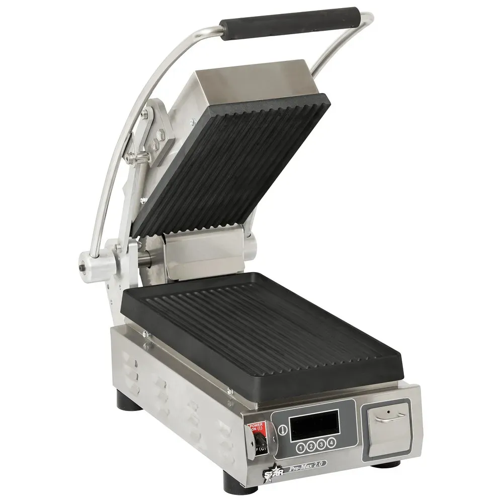 Experience kitchen innovation with the Star PGT7IEA Sandwich / Panini Grill. This high-performance grill is designed to meet the demands of a busy commercial restaurant. Featuring a 7.5" W x 14.2"D grooved cast iron cooking surface, it ensures even heat distribution and perfect grill marks on your sandwiches and paninis. The performance torsion spring hinge with an ergonomic curved handle allows for easy operation and consistent pressure, resulting in deliciously crispy sandwiches every time. The electronic 175-550F thermostat controls with a timer provide precise temperature control, ensuring optimal cooking results. The low profile design and removable grease drawer make cleaning a breeze, while the stainless steel exterior adds durability and a sleek look to your kitchen. With non-skid feet for stability and cULus and UL EPH Classified certifications, this sandwich grill is a reliable and safe choice for any commercial kitchen. Made in the USA, the Star PGT7IEA Sandwich / Panini Grill is a must-have for any restaurant looking to elevate their sandwich game.