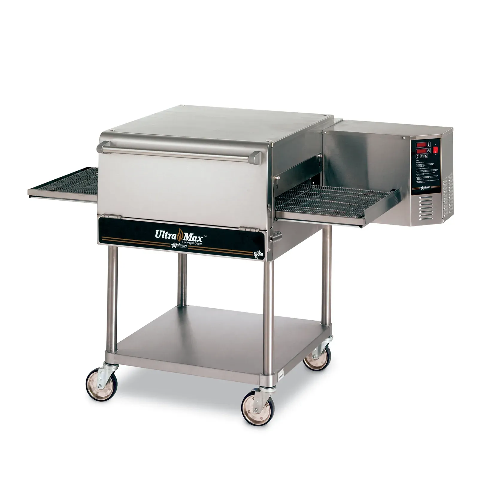 Cook with precision using the Star UM1854 Gas Conveyor Oven. This countertop oven is designed for commercial restaurant use, offering a single deck with a 54" conveyor length. The 18" wide x 28" length cook chamber provides ample space for cooking a variety of dishes. With programmable controls for six menu presets, you can easily customize the cooking process to suit your needs. The conveyor can be set to move from left to right, and it is field convertible for right-to-left operation, providing flexibility in your kitchen layout. The stainless steel bake chamber with easy-to-clean impingement fingers ensures durability and efficiency. With a powerful 40000 BTU gas burner, this oven delivers consistent and even cooking results. Made in the USA and certified by cULus and UL EPH Classified, the Star UM1854 Gas Conveyor Oven is a reliable and high-quality choice for any commercial restaurant.