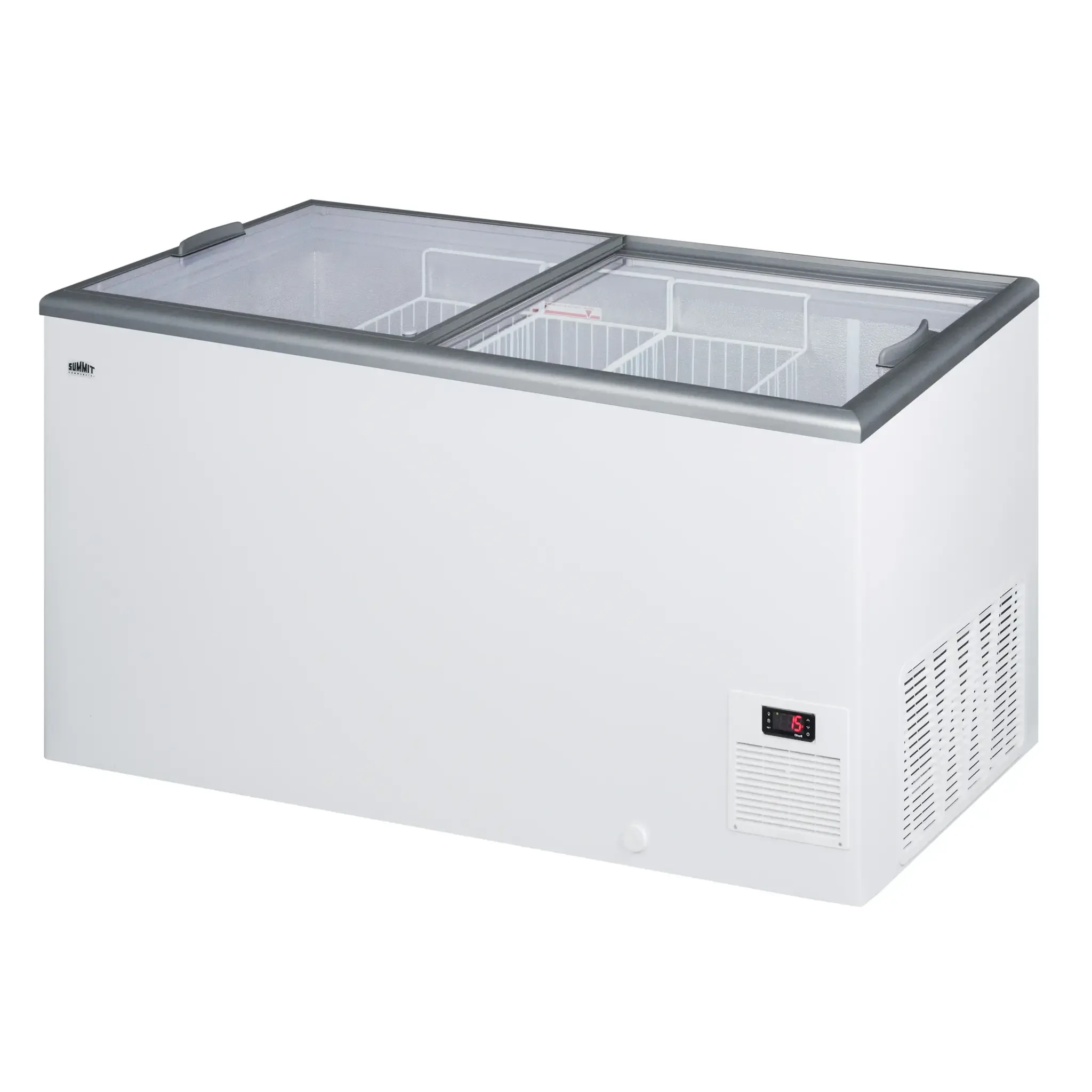 Optimize reliability with the Summit Appliance NOVA45 Chest Freezer. Designed for commercial restaurant use, this chest-style freezer offers a spacious 14.1 cu. ft. capacity to accommodate all your frozen goods. The two sliding flat top tempered glass lids provide easy access and visibility to your inventory, while the removable lock ensures the security of your valuable items. With a temperature range of -13F to 23F and a digital thermostat and controls, you can easily adjust and maintain the perfect freezing conditions for your products. The manual defrost feature allows for hassle-free cleaning and maintenance. The NOVA45 also includes three epoxy coated wire novelty baskets for organized storage. Its aluminum interior and white exterior provide durability and a sleek appearance. Equipped with four casters, this freezer can be easily moved and positioned wherever needed. Trust in the reliability and functionality of the Summit Appliance NOVA45 Chest Freezer for your commercial restaurant needs.