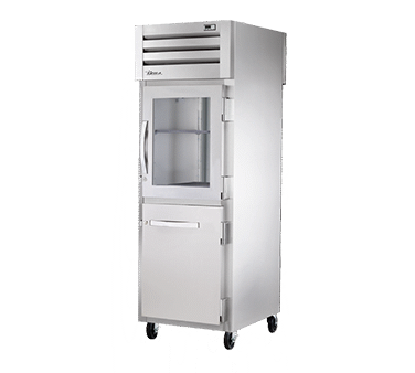 Experience kitchen innovation with the True Manufacturing STA1RPT-1HG/1HS-1S-HC Refrigerator, Pass-Thru. This top-of-the-line refrigerator is designed to meet the demanding needs of commercial restaurants. With its sleek stainless steel front and sides, it not only adds a touch of elegance to your kitchen but also ensures durability and longevity. The pass-thru design, featuring one glass and one stainless steel half doors in the front and a stainless steel door in the rear, allows for easy access and efficient workflow. The cam-lift hinges and locks provide added security and convenience. The digital temperature control ensures precise temperature management, while the LED interior lights and chrome shelves make it easy to organize and locate items. With its 5" castors, this refrigerator can be easily moved for cleaning or rearranging. Made in the USA and certified by cULus and UL EPH Classified, this True Manufacturing refrigerator is a reliable and efficient choice for any commercial kitchen.