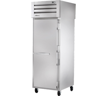 Serve with pride with the True Manufacturing STA1RPT-1S-1G-HC Refrigerator, Pass-Thru. This top-of-the-line refrigeration unit is designed to meet the demanding needs of commercial restaurants. With its stainless steel front and sides, it not only looks sleek and professional but also ensures durability and longevity. The pass-thru design, featuring a stainless steel door front and a glass door rear with locks, allows for easy access and visibility of stored items. The cam-lift hinges provide smooth operation, while the digital temperature control ensures precise temperature management. Inside, you'll find three chrome shelves and LED interior lights, making it easy to organize and locate items. The aluminum interior is easy to clean and maintain. With 5" castors, this unit is easy to move and position. Plus, it uses R290 Hydrocarbon refrigerant, which is environmentally friendly. Trust True Manufacturing for a reliable and efficient refrigeration solution for your commercial restaurant.