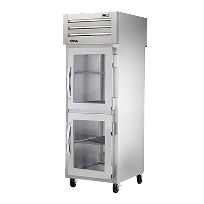 Unleash your kitchen's potential with the True Manufacturing STA1RPT-2HG-1S-HC Refrigerator, Pass-Thru. This top-of-the-line refrigeration unit is designed to meet the demanding needs of commercial restaurants. With its SPEC SERIES construction, this refrigerator offers exceptional durability and performance. It features two glass half doors in the front and a stainless steel door in the rear, all equipped with locks for added security. The cam-lift hinges ensure smooth and effortless door operation. The digital temperature control allows precise temperature management, while the LED interior lights provide excellent visibility. The three chrome shelves offer ample storage space for your ingredients and products. Made in the USA, this refrigerator is built to last. Its stainless steel front and sides, along with the aluminum interior, make it easy to clean and maintain. With its 5" castors, this unit is also highly portable. Trust True Manufacturing to deliver reliable and efficient refrigeration solutions for your commercial kitchen.