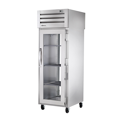 Maximize your food service potential with the True Manufacturing STG1RPT-1G-1G-HC Refrigerator, Pass-Thru. This top-of-the-line refrigerator is designed to meet the demands of a busy commercial restaurant. With its sleek stainless steel front and aluminum sides, it not only looks professional but is also built to last. The pass-thru design, featuring glass doors on both the front and rear with locks, allows for easy access and visibility of your stored items. The cam-lift hinges ensure smooth operation, while the digital temperature control ensures precise temperature management. Inside, you'll find an aluminum interior with three gray shelves, providing ample storage space. The LED interior lights illuminate the contents, making it easy to find what you need. With its ENERGY STAR certification and use of R290 Hydrocarbon refrigerant, this refrigerator is not only efficient but also environmentally friendly. Trust True Manufacturing to deliver a reliable and high-performing refrigerator for your commercial kitchen.