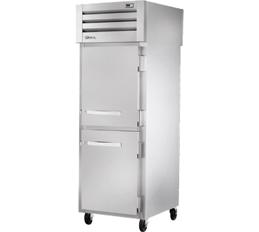 Invest in superior quality with the True Manufacturing STG1RPT-2HS-1G-HC Refrigerator, Pass-Thru. This top-of-the-line refrigerator is designed to meet the demanding needs of commercial restaurants. With its sleek stainless steel front, aluminum sides, and aluminum interior, it not only looks great but is also built to last. The pass-thru design, featuring two stainless steel half doors in the front and a glass door in the rear, allows for easy access and efficient workflow in busy kitchen environments. The cam-lift hinges and locks ensure secure closure, while the digital temperature control guarantees precise temperature management. Inside, you'll find three gray shelves and LED interior lights, providing ample storage space and excellent visibility. Equipped with 5" castors, this refrigerator is easy to move and clean. Made in the USA and certified by cULus and UL EPH Classified, the True Manufacturing STG1RPT-2HS-1G-HC is the perfect choice for any commercial restaurant looking for a reliable and efficient pass-thru refrigerator.
