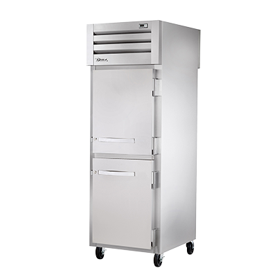 Elevate your culinary experience with the True Manufacturing STR1RPT-2HS-1S-HC Refrigerator, Pass-Thru. This top-of-the-line refrigerator is designed to meet the demanding needs of commercial restaurants. With its sleek stainless steel construction, this unit not only looks professional but is also built to withstand the rigors of a busy kitchen. The pass-thru design allows for easy access from both the front and rear, making it convenient for food preparation and storage. Equipped with two stainless steel half doors in the front and one stainless steel door in the rear, all with locks and cam-lift hinges, you can rest assured that your ingredients will be securely stored. The digital temperature control ensures precise temperature management, while the LED interior lights provide excellent visibility. With its 5" castors, this refrigerator is easy to move and clean. Made in the USA and certified by cULus and UL EPH Classified, this True Manufacturing refrigerator is a reliable and efficient choice for any commercial kitchen.