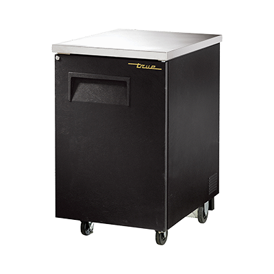 Introducing the True Manufacturing TBB-1-HC Back Bar Cabinet, Refrigerated - the perfect addition to drive restaurant profitability. Designed by True Manufacturing, a trusted name in the industry, this one-section back bar cooler is a must-have for any commercial restaurant. With a capacity to hold 30 six-packs or one half keg, it ensures you never run out of chilled beverages for your customers. The stainless steel countertop provides a sleek and durable surface, while the solid hinged door with lock keeps your stock secure. The LED interior lights illuminate the galvanized interior with a stainless steel floor, making it easy to find what you need. The black vinyl exterior adds a touch of sophistication to your establishment. This ENERGY STAR certified back bar cabinet is not only efficient but also environmentally friendly, thanks to the R290 Hydrocarbon refrigerant. With its reliable performance and made in the USA quality, the True Manufacturing TBB-1-HC is the ultimate choice for commercial restaurants looking to enhance their beverage service.