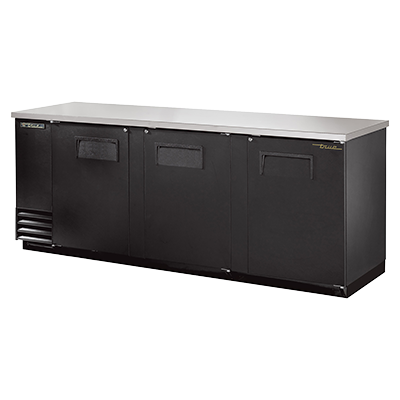 Deliver food perfection with the True Manufacturing TBB-4-HC Back Bar Cabinet. This three-section cooler is designed to meet the demands of a busy commercial restaurant. With a capacity to hold 152 six-packs or 4 half kegs, this cooler ensures you never run out of cold beverages for your customers. The condensing unit is conveniently located on the left side, allowing for easy access and maintenance. The stainless steel top provides a durable and hygienic surface for preparing drinks. The three full doors come with locks, ensuring the security of your valuable inventory. LED interior lights illuminate the contents, making it easy to find what you need. The galvanized interior with a stainless steel floor is easy to clean and maintain. The black vinyl exterior adds a sleek and professional look to your establishment. With its ENERGY STAR certification and use of R290 Hydrocarbon refrigerant, this back bar cabinet is not only efficient but also environmentally friendly. Trust True Manufacturing to deliver the quality and reliability your restaurant needs.
