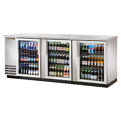 Cook with confidence and flair with the True Manufacturing TBB-4G-S-HC-LD Back Bar Cabinet. This three-section cooler is designed to meet the needs of a busy commercial restaurant. With a capacity to hold 152 six-packs or 4 half kegs, you'll never run out of cold beverages for your customers. The condensing unit is conveniently located on the left side, allowing for easy access and maintenance. The stainless steel top and glass doors with locks not only provide durability but also give your establishment a sleek and professional look. The LED interior light illuminates the contents, making it easy to find what you need. The galvanized interior with a stainless steel floor ensures easy cleaning and hygiene. Made in the USA and ENERGY STAR certified, this back bar cabinet is not only reliable but also energy-efficient. Upgrade your restaurant with the True Manufacturing TBB-4G-S-HC-LD Back Bar Cabinet and elevate your beverage service to the next level.