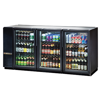 Experience kitchen innovation with the True Manufacturing TBB-24GAL-72G-HC-LD Back Bar Cabinet. This three-section cooler is designed to meet the demands of a busy commercial restaurant. With a capacity to hold 84 six-packs or 3 half kegs, this cooler ensures you never run out of cold beverages for your customers. The galvanized sub top and glass doors with locks provide durability and security, while the LED interior light illuminates the contents for easy visibility. The galvanized interior with a stainless steel floor is easy to clean, making maintenance a breeze. The black vinyl exterior adds a sleek and professional look to your establishment. Powered by R290 Hydrocarbon refrigerant and a 1/4 HP compressor, this cooler is energy-efficient and environmentally friendly. Made in the USA, this True Manufacturing Back Bar Cabinet is a reliable and high-quality addition to any commercial kitchen.