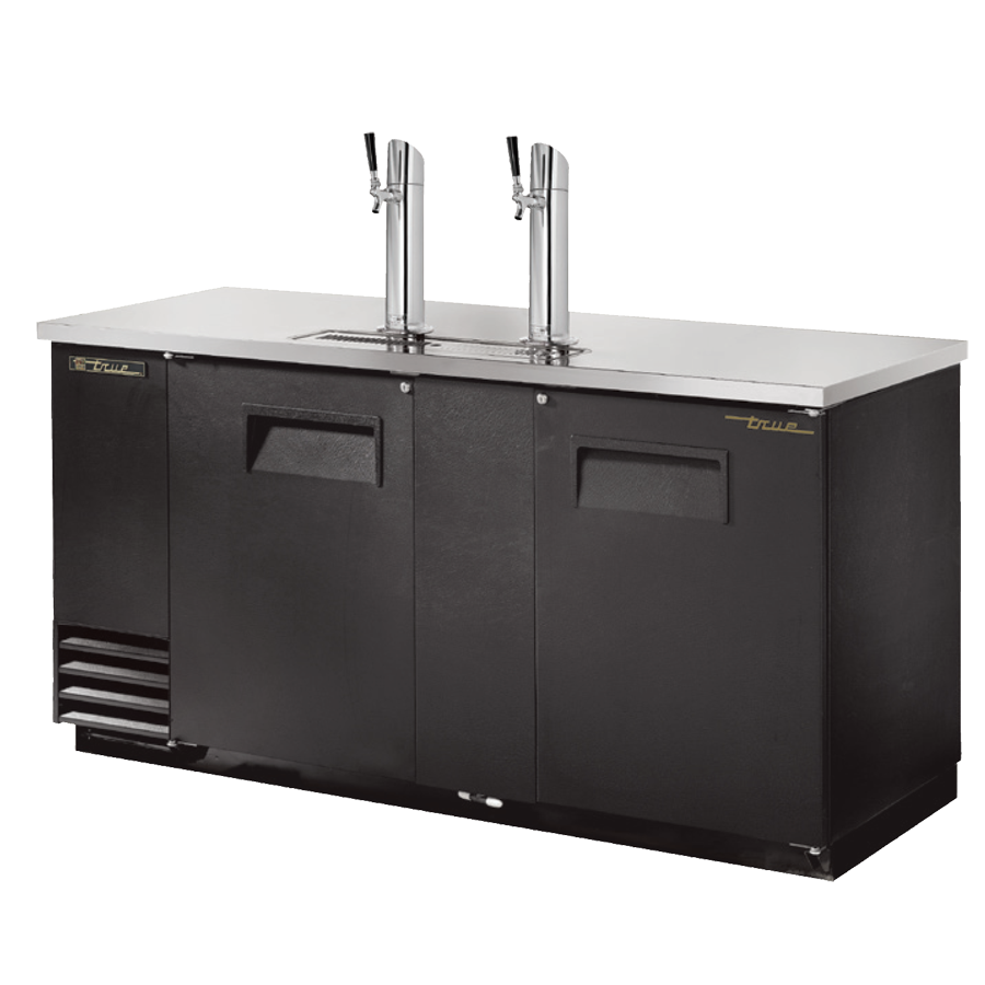 Equip your commercial kitchen with the True Manufacturing TDD-3-HC Draft Beer Cooler. This top-of-the-line cooler is designed to meet the needs of busy restaurants and bars. With a capacity for three half kegs, it ensures you always have a variety of draft beers on tap to satisfy your customers' thirst. The stainless steel countertop provides a durable and easy-to-clean surface, while the two solid hinged doors with locks keep your inventory secure. The LED interior light illuminates the contents, making it easy to find the perfect brew. The insulated beer columns with a single faucet draft arm ensure that each pour is perfectly chilled. The black vinyl exterior and galvanized interior with a stainless steel floor not only look sleek but also withstand the rigors of a commercial kitchen. With its ENERGY STAR rating and use of R290 Hydrocarbon refrigerant, this cooler is not only efficient but also environmentally friendly. Trust True Manufacturing, a reputable vendor known for their high-quality products made in the USA. Upgrade your establishment with the True Manufacturing TDD-3-HC Draft Beer Cooler.