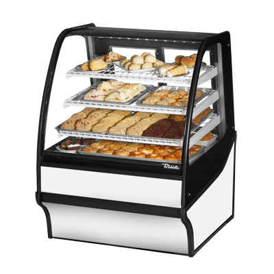 Unleash culinary creativity with the True Manufacturing TDM-DC-36-GE/GE-S-W Display Case. Designed specifically for non-refrigerated bakery items, this display merchandiser is a must-have for any commercial restaurant. With its curved glass front and glass sides, it offers a clear view of your delectable treats, enticing customers to indulge. The two rear sliding glass doors provide easy access for staff while maintaining the perfect temperature inside. The three tiered levels of adjustable white PVC coated wire shelves allow for versatile display options, accommodating a variety of baked goods. The LED interior lighting illuminates your products, making them even more enticing to customers. Made in the USA with a stainless steel exterior and white powder coated interior, this display case is not only durable but also easy to clean. Trust True Manufacturing to deliver high-quality equipment that enhances your bakery's presentation and drives sales.