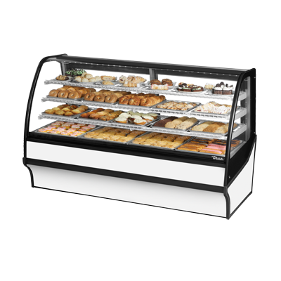Achieve kitchen supremacy with the True Manufacturing TDM-DC-77-GE/GE-W-W Display Case. This non-refrigerated bakery display merchandiser is designed to elevate your restaurant's presentation and entice customers with its sleek and modern design. The curved glass front and glass sides provide a clear view of your delectable baked goods, while the two rear sliding glass doors make it easy to access and restock your products. With three tiered levels of adjustable white PVC coated wire shelves, you can showcase a variety of pastries, cakes, and breads. The LED interior lighting illuminates your treats, making them even more irresistible. Made in the USA, this display case features a white powder coated exterior with black trim, giving it a clean and professional look. Whether you're running a bakery, cafe, or restaurant, the True Manufacturing TDM-DC-77-GE/GE-W-W Display Case is the perfect addition to enhance your establishment's ambiance and boost sales.