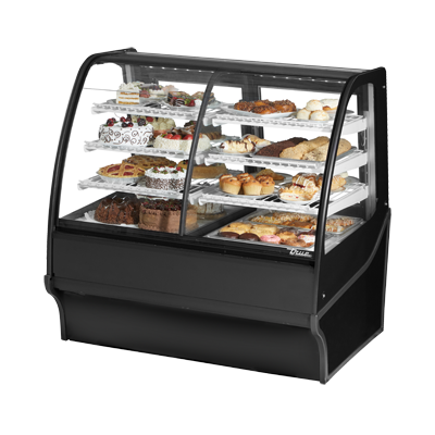 Experience kitchen innovation with the True Manufacturing TDM-DZ-48-GE/GE-B-W Display Case. This dual-zone merchandiser is perfect for commercial restaurants looking to showcase their products in style. The two rear sliding glass doors provide easy access for restocking and cleaning. The three tiered levels of adjustable white PVC coated wire shelves allow for flexible display options, accommodating a variety of products. The LED interior lighting illuminates your merchandise, making it even more enticing to customers. The black powder coated exterior and white powder coated interior give this display case a sleek and professional look. With its self-contained refrigeration system and R290 Hydrocarbon refrigerant, this display case is energy efficient and environmentally friendly. Trust True Manufacturing, a leader in commercial refrigeration, and elevate your restaurant's display game with the TDM-DZ-48-GE/GE-B-W Display Case.