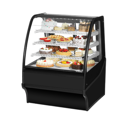 Master the art of cooking with the True Manufacturing TDM-R-36-GE/GE-S-S Display Case. This refrigerated bakery display merchandiser is designed to showcase your delectable creations in a stylish and efficient manner. With its curved glass front and glass sides, customers will be enticed by the enticing display of your baked goods. The two rear sliding glass doors make it easy for staff to access and restock the shelves, which can be adjusted to three tiered levels to accommodate different sizes of pastries and desserts. The LED interior lighting illuminates your treats, making them even more irresistible. Made in the USA with a stainless steel exterior and interior, this display case is not only durable but also easy to clean. The use of R290 Hydrocarbon refrigerant ensures energy efficiency, while the 1/4 HP compressor provides reliable cooling. Perfect for commercial restaurant use, this True Manufacturing display case is a must-have for any bakery or cafe.