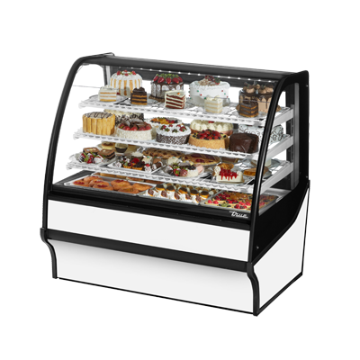 Fuel your restaurant's success with the True Manufacturing TDM-R-48-GE/GE-S-W Display Case. Designed specifically for commercial restaurant use, this refrigerated bakery display merchandiser is a must-have for showcasing your delectable baked goods. The curved glass front and glass sides provide an enticing view of your treats, while the two rear sliding glass doors allow for easy access and restocking. With three tiered levels of adjustable white PVC coated wire shelves, you can arrange your products in an organized and visually appealing manner. The LED interior lighting illuminates your baked goods, making them even more irresistible to customers. Made in the USA with a stainless steel exterior and white powder coated interior, this display case is not only durable but also easy to clean. The use of R290 Hydrocarbon refrigerant ensures energy efficiency, while the 1/2 HP compressor provides reliable cooling. Trust True Manufacturing to deliver high-quality equipment that enhances your bakery's presentation and boosts sales.