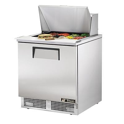 Deliver food perfection with the True Manufacturing TFP-32-12M Refrigerated Counter, Mega Top Sandwich / Salad Unit. This one-section, self-contained unit is designed to meet the demands of a busy commercial restaurant. With its 12 poly pans, you can easily store and organize your sandwich and salad ingredients. The stainless steel insulated cover ensures that your ingredients stay fresh and at the perfect temperature. The 8-inch thick cutting board provides a convenient workspace for preparing your dishes. The stainless steel front, top, and sides, along with the aluminum back, make this unit durable and easy to clean. The aluminum interior with a stainless steel floor is both hygienic and resistant to corrosion. With rear-mounted refrigeration and 2.5-inch castors, this unit is easy to move and position in your kitchen. Trust in the True Manufacturing TFP-32-12M to deliver the quality and reliability you need for your restaurant's food preparation.