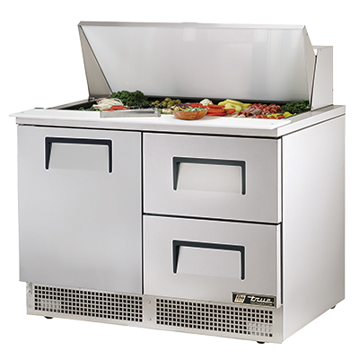 Equip your kitchen for success with the True Manufacturing TFP-48-18M-D-2 Refrigerated Counter, Mega Top Sandwich / Salad Unit. This two-section, self-contained unit is designed to meet the demands of a busy commercial restaurant. It features 18 poly pans, each with a 4-inch depth, perfect for storing and organizing your sandwich and salad ingredients. The stainless steel insulated cover ensures that your ingredients stay fresh and at the right temperature. The unit also comes with a durable 8-inch thick cutting board, providing a convenient workspace for food preparation. With its stainless steel front, top, and sides, as well as an aluminum back, this unit is built to withstand the rigors of a commercial kitchen. The two drawers and one door offer ample storage space, accommodating various pan sizes. The adjustable wire shelves allow for flexible storage options. The rear-mounted refrigeration system ensures efficient cooling, while the 2.5-inch castors make it easy to move the unit around. Trust True Manufacturing, a reputable brand known for its quality and reliability. Upgrade your kitchen with the True Manufacturing TFP-48-18M-D-2 Refrigerated Counter, Mega Top Sandwich / Salad Unit and experience enhanced efficiency and productivity.