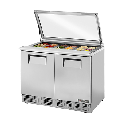 Cooking at its finest begins with the True Manufacturing TFP-48-18M-FGLID Refrigerated Counter, Mega Top Sandwich/Salad Unit. This two-section, self-contained unit is designed to meet the demands of a busy commercial restaurant. With its heavy-duty flat glass lid and 18 poly pans, you can easily store and display a variety of sandwiches and salads. The 8-inch deep, 1/2-inch thick cutting board provides ample space for food preparation, while the stainless steel front, top, and sides ensure durability and easy cleaning. The aluminum back and interior with a stainless steel floor add to its longevity. The rear-mounted refrigeration system keeps your ingredients fresh and ready for use. With four shelves and 2.5-inch castors, this unit offers convenient storage and mobility. Made in the USA and UL EPH Classified, the True Manufacturing TFP-48-18M-FGLID is a reliable and efficient addition to any commercial kitchen.