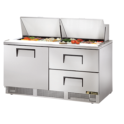 Unleash culinary creativity with the True Manufacturing TFP-64-24M-D-2 Refrigerated Counter, Mega Top Sandwich / Salad Unit. This two-section, self-contained unit is designed to meet the demands of a busy commercial restaurant kitchen. With its stainless steel front, top, and sides, as well as an aluminum back, this unit is built to withstand the rigors of a professional kitchen. The unit features a stainless steel insulated cover and an 8-inch thick cutting board, providing ample space for food preparation. Inside, you'll find an aluminum interior with a stainless steel floor, along with two adjustable shelves and two drawers. The rear-mounted refrigeration system ensures consistent cooling, while the 2-1/2-inch castors make it easy to move the unit around. With its versatility and durability, the True Manufacturing TFP-64-24M-D-2 is the perfect addition to any commercial restaurant looking to elevate their sandwich and salad offerings.