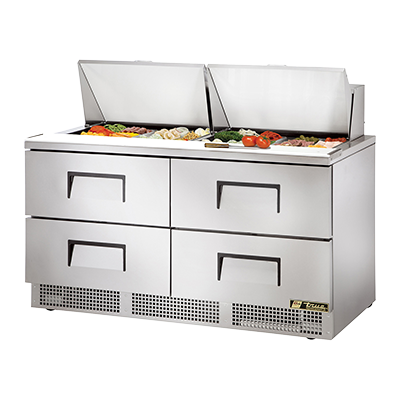Kitchen innovation at its best, the True Manufacturing TFP-64-24M-D-4 Refrigerated Counter is a must-have for any commercial restaurant. This two-section, self-contained sandwich/salad unit is designed to meet the demands of a busy kitchen. With its (24) 1/6 size (4"D) poly pans, you can easily store and organize your ingredients. The stainless steel insulated cover ensures optimal temperature control, while the 8"D x 1/2" thick cutting board provides a convenient workspace. The four drawers can accommodate (2) 12" x 20" x 6"D pans each (pans not included), allowing for easy access to your prepped items. Made in the USA, this unit features a durable stainless steel front, top, and sides, as well as an aluminum back for long-lasting performance. The aluminum interior with a stainless steel floor is easy to clean, and the rear-mounted refrigeration system ensures efficient cooling. With its 2-1/2" castors, this unit is easy to move around your kitchen. Trust True Manufacturing for quality and reliability in your restaurant kitchen.