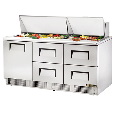 Enhance your commercial kitchen with the True Manufacturing TFP-72-30M-D-4 Refrigerated Counter, Mega Top Sandwich / Salad Unit. This three-section, self-contained unit is designed to meet the demands of a busy restaurant kitchen. It comes with (30) 1/6 size (4"D) poly pans, allowing you to store a variety of ingredients for sandwiches and salads. The stainless steel insulated cover keeps your ingredients fresh and ready to use. The unit also features an 8"D x 1/2" thick cutting board, providing a convenient workspace for food preparation. With its stainless steel front, top, and sides, as well as an aluminum back, this unit is built to withstand the rigors of a commercial kitchen. The (1) door and (4) drawers offer ample storage space, accommodating various pan sizes. The aluminum interior with a stainless steel floor ensures durability and easy cleaning. The rear-mounted refrigeration system keeps your ingredients at the perfect temperature. With its 2-1/2" castors, this unit is easy to move and clean around. Trust True Manufacturing, a reputable brand known for its quality and reliability. Invest in the TFP-72-30M-D-4 Refrigerated Counter, Mega Top Sandwich / Salad Unit to streamline your kitchen operations and deliver fresh, delicious sandwiches and salads to your customers.