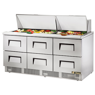 Fuel your passion for cooking with the True Manufacturing TFP-72-30M-D-6 Refrigerated Counter, Mega Top Sandwich/Salad Unit. This three-section, self-contained unit is designed to meet the demands of a busy commercial restaurant. It comes with (30) 1/6 size poly pans, allowing you to store a variety of ingredients for sandwiches and salads. The stainless steel insulated cover ensures that your ingredients stay fresh and at the perfect temperature. The unit also features an 8-inch thick cutting board, providing a convenient workspace for food preparation. With (6) drawers, each accommodating (1) 12" x 20" x 6"D pan and (3) 1/9 size or (6) 1/6 size and (3) 1/9 size pans, you'll have plenty of storage space. The aluminum interior with a stainless steel floor is easy to clean and maintain. With rear-mounted refrigeration and 2-1/2" castors, this unit is both efficient and mobile. Trust True Manufacturing for quality and durability. Made in the USA, this refrigerated counter is cULus and UL EPH Classified. Upgrade your restaurant's food preparation capabilities with the True Manufacturing TFP-72-30M-D-6 Refrigerated Counter, Mega Top Sandwich/Salad Unit.