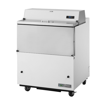 Elevate your cuisine with the True Manufacturing TMC-34-HC Milk Cooler / Station. This mobile milk cooler is designed to meet the needs of commercial restaurants, ensuring that your dairy products are stored at the perfect temperature. With its forced-air cooling system, this cooler maintains a temperature range of 33 - 38F, keeping your milk and other dairy products fresh and ready for use. The stainless steel door with a drop front and hold-open flip-up lids provides easy access to the contents, while the lock ensures the security of your inventory. The white vinyl exterior and aluminum interior with a stainless steel floor not only make this cooler durable but also easy to clean. The TMC-34-HC comes with two heavy-duty floor racks, allowing you to store and organize up to eight crates of milk. The digital thermometer lets you monitor the temperature at a glance, ensuring that your dairy products are always stored at the optimal conditions. With its R290 Hydrocarbon refrigerant, this milk cooler is environmentally friendly and energy-efficient. The 4" castors make it easy to move the cooler around your kitchen as needed. Made in the USA, this True Manufacturing milk cooler is cULus and UL EPH Classified, guaranteeing its quality and safety. Elevate your restaurant's dairy storage with the True Manufacturing TMC-34-HC Milk Cooler / Station.