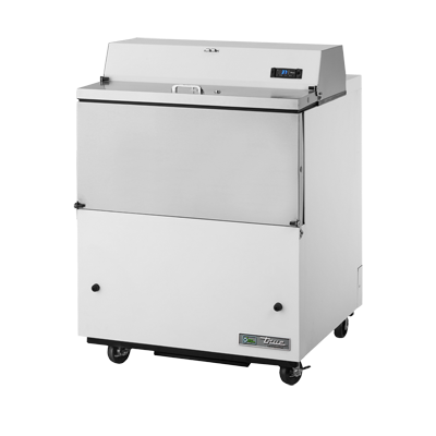 Kitchen innovation at its best, the True Manufacturing TMC-34-SS-HC Milk Cooler/Station is a must-have for any commercial restaurant. This mobile milk cooler is designed to keep your milk products fresh and easily accessible. With its forced-air cooling system, it ensures consistent temperatures between 33 - 38F, guaranteeing optimal storage conditions. The stainless steel drop front/hold-open flip-up lids provide easy access to the contents, while the lock ensures the security of your valuable inventory. The white vinyl exterior not only adds a sleek and professional look to your kitchen but also makes it easy to clean and maintain. Inside, the stainless steel interior and floor offer durability and hygiene. The two heavy-duty floor racks provide ample storage space for up to 8 crates of milk. Equipped with a digital thermometer, you can easily monitor and adjust the temperature as needed. The TMC-34-SS-HC also features 4" castors for easy mobility and a 1/5 HP compressor for efficient cooling. Made in the USA, this milk cooler is cULus and UL EPH Classified, ensuring its quality and safety. Upgrade your restaurant's milk storage with the True Manufacturing TMC-34-SS-HC Milk Cooler/Station.