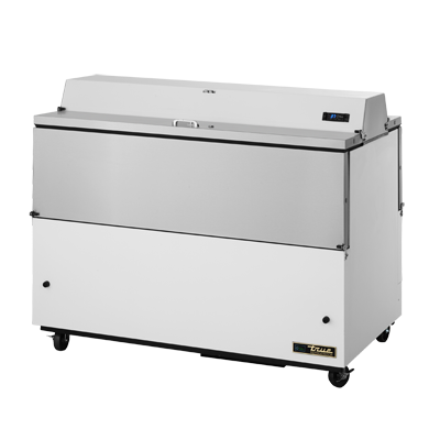 Enhance the heart of your restaurant with the True Manufacturing TMC-58-DS-SS-HC Milk Cooler / Station. This mobile milk cooler is designed to meet the demands of a busy commercial restaurant. With its forced-air system and dual-sided stainless steel drop front/hold-open flip-up lids, it provides easy access and efficient cooling for up to 16 crates of milk. The locks ensure the safety and security of your inventory. The white vinyl exterior and stainless steel interior and floor not only give it a sleek and professional look but also make it easy to clean and maintain. The three heavy-duty floor racks provide ample storage space, while the digital thermometer allows you to monitor the temperature accurately. With its 4" castors, this milk cooler is easy to move around the kitchen. Made in the USA and certified by cULus and UL EPH Classified, you can trust the quality and reliability of True Manufacturing. Upgrade your restaurant's milk storage with the True Manufacturing TMC-58-DS-SS-HC Milk Cooler / Station.