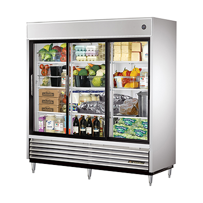 Ignite culinary passion with the True Manufacturing TSD-69G-LD Refrigerator, Reach-In. This top-of-the-line refrigerator is a must-have for any commercial restaurant. With its sleek stainless steel front and aluminum sides, it not only looks great but is also built to last. The clear coated aluminum interior with a stainless steel floor provides durability and easy cleaning. The three glass sliding doors allow for easy access to your ingredients while keeping them visible for quick inventory checks. The nine PVC coated wire shelves provide ample storage space for all your perishable items. The LED interior lighting ensures that everything is well-lit and easy to find. With a 1/2 HP compressor, this refrigerator is powerful enough to keep your ingredients at the perfect temperature. Made in the USA and certified by cULus, UL EPH Classified, and CE, you can trust the quality and reliability of True Manufacturing. Upgrade your restaurant's refrigeration system with the True Manufacturing TSD-69G-LD Refrigerator, Reach-In.