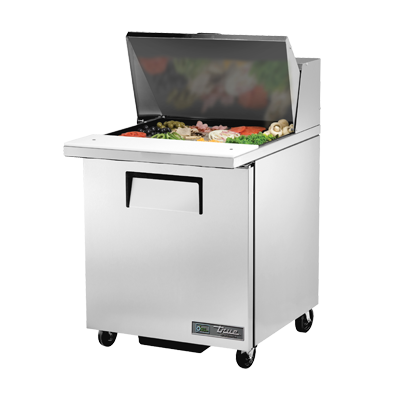 Master the art of flavor with the True Manufacturing TSSU-27-12M-C-HC Refrigerated Counter, Mega Top Sandwich/Salad Unit. This top-of-the-line unit is designed to meet the demands of a busy commercial restaurant, ensuring that your ingredients stay fresh and ready for use. With its stainless steel insulated cover and series stainless steel top, front, and sides, this unit is not only durable but also easy to clean. The unit features a spacious interior with (12) 1/6 size poly pans, allowing you to store a variety of ingredients for sandwiches and salads. The 8-7/8"D cutting board provides a convenient workspace for food preparation. Equipped with a door and two shelves, this unit offers ample storage space for your restaurant's needs. The aluminum interior with a stainless steel floor ensures optimal hygiene, while the 5" castors make it easy to move the unit around. With its energy-efficient design and R290 Hydrocarbon refrigerant, this unit is not only environmentally friendly but also cost-effective. Trust True Manufacturing to deliver high-quality refrigeration solutions for your commercial restaurant.