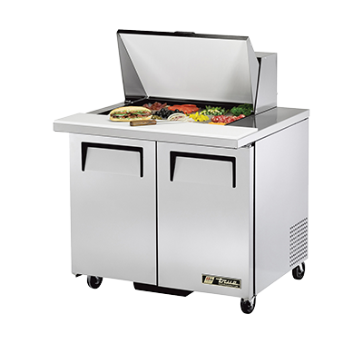 Master the art of flavor with the True Manufacturing TSSU-36-12M-B-HC Refrigerated Counter, Mega Top Sandwich/Salad Unit. This top-of-the-line unit is designed to meet the demands of a busy commercial restaurant, ensuring that your ingredients stay fresh and ready for use. With its mega top design, this unit can accommodate up to 12 1/6 size poly pans, allowing you to store a variety of toppings, dressings, and condiments. The stainless steel insulated cover keeps everything at the perfect temperature, while the 8-7/8" cutting board provides a convenient workspace for assembling sandwiches and salads. The stainless steel construction of the top, front, and sides, along with the aluminum back, ensures durability and easy cleaning. The unit also features two full doors and four shelves for additional storage. With its efficient refrigeration system and hydrocarbon refrigerant, this unit is not only energy-efficient but also environmentally friendly. Trust True Manufacturing to deliver a reliable and high-quality refrigerated counter that will enhance your restaurant's efficiency and productivity.