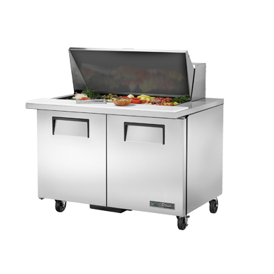 Take your kitchen to the next level with the True Manufacturing TSSU-48-18M-B-HC Refrigerated Counter, Mega Top Sandwich/Salad Unit. This top-of-the-line unit is designed to meet the demands of a busy commercial restaurant. With its mega top design, it can accommodate up to 18 1/6 size poly pans, allowing you to store and organize a variety of ingredients for sandwiches and salads. The stainless steel insulated cover ensures that your ingredients stay fresh and at the perfect temperature. The unit also features a spacious cutting board, stainless steel top, front, and sides, and an aluminum back for durability. With two full doors and four PVC coated wire shelves, you'll have plenty of storage space for all your ingredients. The aluminum interior with a stainless steel floor is easy to clean and maintain. Equipped with 5" castors, this unit is easy to move around your kitchen. Plus, it uses R290 Hydrocarbon refrigerant, making it energy-efficient and environmentally friendly. Upgrade your kitchen with the True Manufacturing TSSU-48-18M-B-HC Refrigerated Counter, Mega Top Sandwich/Salad Unit and experience the convenience and efficiency it brings to your restaurant.