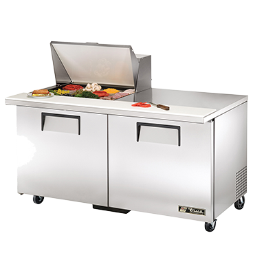 Invest in superior quality with the True Manufacturing TSSU-60-12M-B-HC Refrigerated Counter, Mega Top Sandwich / Salad Unit. This top-of-the-line unit is designed to meet the demanding needs of commercial restaurants. With its stainless steel insulated cover and 8-7/8"D cutting board, it provides a hygienic and convenient workspace for preparing sandwiches and salads. The unit features (12) 1/6 size (4"D) poly pans, allowing for efficient organization and easy access to ingredients. The stainless steel top, front, and sides, along with the aluminum back, ensure durability and longevity. The aluminum interior with a stainless steel floor is easy to clean and maintain. Equipped with (2) full doors and (4) shelves, this unit offers ample storage space for your ingredients and supplies. The 5" castors make it easy to move the unit around the kitchen. With its energy-efficient design and R290 Hydrocarbon refrigerant, this unit not only saves on energy costs but also helps reduce environmental impact. Invest in the True Manufacturing TSSU-60-12M-B-HC and elevate your restaurant's efficiency and productivity.