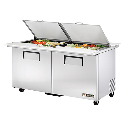Equip your kitchen for success with the True Manufacturing TSSU-60-24M-B-DS-ST-HC Refrigerated Counter, Mega Top Sandwich/Salad Unit. This high-quality unit is designed to meet the demands of a busy commercial restaurant. With its dual side mega top, you can easily store and access all your sandwich and salad ingredients. The unit comes with 24 poly pans, each with a 4-inch depth, allowing you to organize your ingredients efficiently. The stainless steel insulated covers keep your ingredients fresh and protected. The cutting boards provide a convenient workspace for food preparation. Made in the USA, this unit features a stainless steel top, front, and sides, ensuring durability and easy cleaning. The aluminum back and interior with a stainless steel floor further enhance its longevity. The two full doors and four shelves offer ample storage space. Equipped with 5-inch castors, this unit is easy to move around your kitchen. The True Manufacturing TSSU-60-24M-B-DS-ST-HC is a reliable and efficient choice for any commercial restaurant.