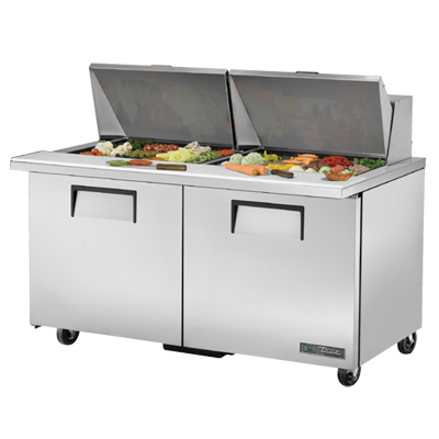 Enhance your commercial kitchen with the True Manufacturing TSSU-60-24M-B-ST-HC Refrigerated Counter, Mega Top Sandwich / Salad Unit. This top-of-the-line unit is designed to meet the demands of a busy restaurant kitchen. With its spacious interior and 24 poly pans, you'll have plenty of room to store and organize your ingredients. The stainless steel insulated covers ensure that your food stays fresh and at the perfect temperature. The 8-7/8" cutting board provides a convenient workspace for preparing sandwiches and salads. Made in the USA, this unit is built to last with its durable stainless steel top, front, and sides. The aluminum back and interior with a stainless steel floor make for easy cleaning and maintenance. Equipped with four shelves and two full doors, you'll have quick and easy access to all your ingredients. The 5" castors allow for easy mobility, making it effortless to clean around the unit. With its energy-efficient design and R290 Hydrocarbon refrigerant, this unit is not only good for your business but also for the environment. Invest in the True Manufacturing TSSU-60-24M-B-ST-HC Refrigerated Counter, Mega Top Sandwich / Salad Unit and take your commercial kitchen to the next level.